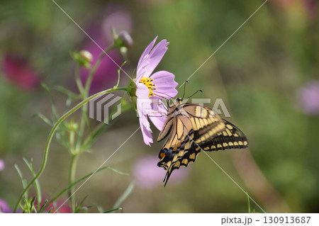 The swallowtail butterfly 秋晴れの草原でコスモスの花に揺れるアゲハチョウ