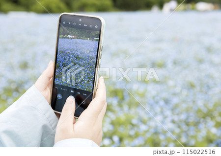 ネモフィラの花畑をスマホで撮影する女の子手元