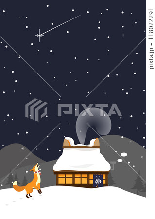 雪降る夜、キツネとキツネの湯屋をイメージした背景イラスト 縦