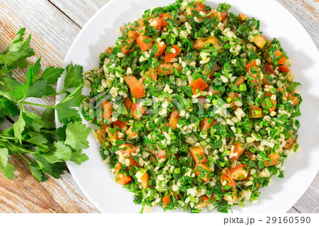 Top-Down View of Rustic Bowl with Cooked Freekeh and Parsley Garnish