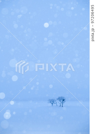 雪原に振る雪と遠くの木立
