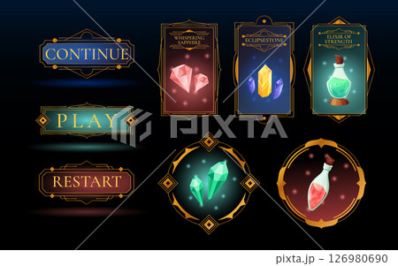 Game UI frame. Magic button. Fantasy icon. Stone interface with glowing HUD. Blue target divider Loot gemstone card. Charming reward gems. Potion bottle. Vector luxury FUI garish screen elements set