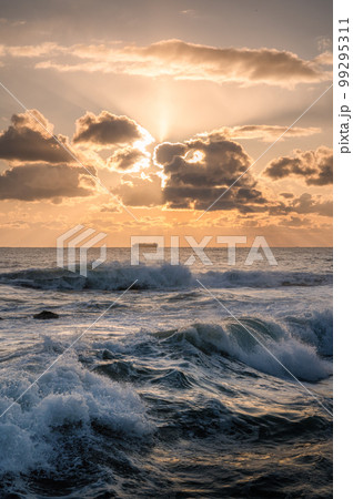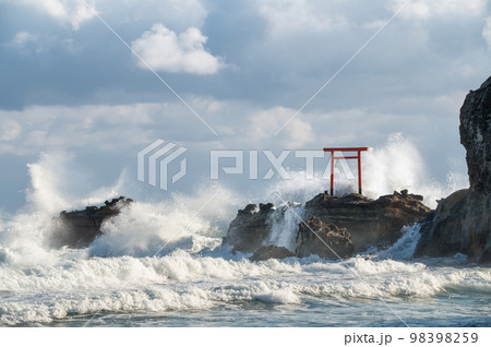 福島県いわき市 高波荒れる波立海岸弁天島の朝