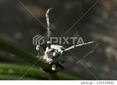 山羊にそっくりな風貌に変貌したボーベリア菌菌糸に覆われたカミキリムシの頭アップポートレート