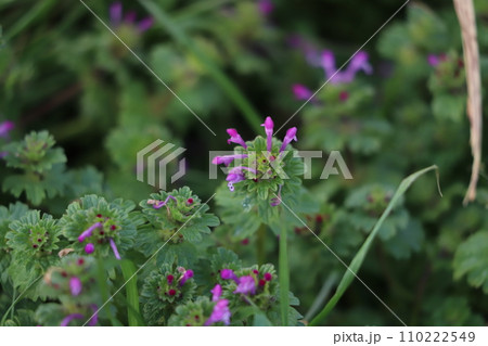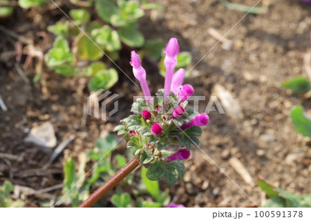 冬の野原に咲くピンク色のホトケノザ(仏の座)の小さな花