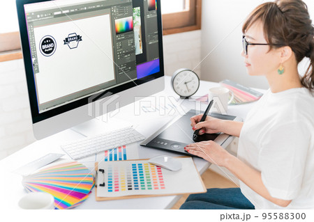 パソコン(ペンタブ)でロゴデザインを考える女性(クリエイティブ・アイディア)
