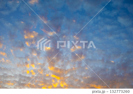 Golden sunrise clouds glowing in dramatic blue sky panorama