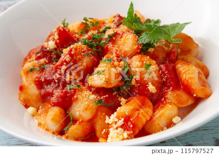 Gnocchi with tomato sauce and parmigiano on a plate
