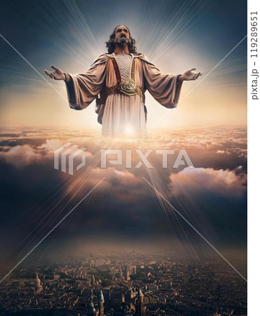 雲の上で手を広げ神々しい光を放つ神様 ai生成画像