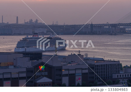 日本の横浜都市景観 出港するノールダムを望む。(大さん橋には飛鳥Ⅱ)(シーボーン・クエストが初入港)