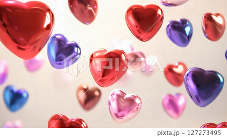明るいハート型の風船のクラスターが白い背景に対して水平に浮かんでいます