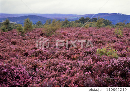 満開ヘザーと緑の清涼感溢れる風景