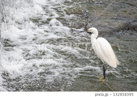 堰の下でエサを狙うシラサギ(ダイサギ) 京都市鴨川