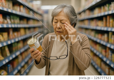 スーパーで缶詰の小さな文字が読めず困るシニア女性