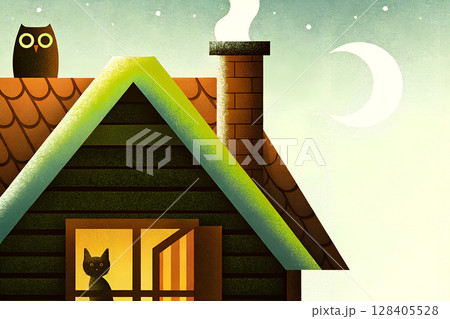 家の屋根にとまるフクロウと窓際に座る猫