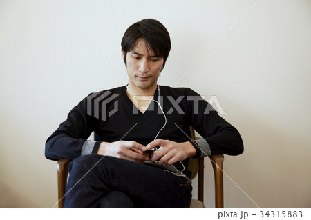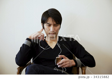 音楽を聴く男性。白壁バック。