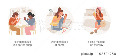 Fixing makeup isolated cartoon vector illustration set. Teenage girls put on makeup in coffee shop, applying cosmetics, looking in mirror, painting lips on the way, stylish teen vector cartoon.