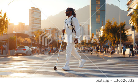 A visually impaired person confidently walking in the city with a smart AI cane. Ideal for inclusive tech, accessibility, and social equality themes.