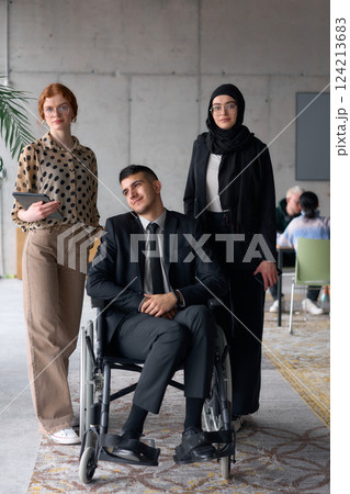 A diverse business team poses confidently, including a smiling director seated in a wheelchair, flanked by two professional female colleagues, one wearing a hijab and the other holding a tablet, in a