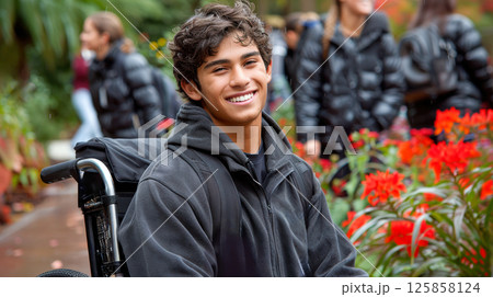 Smiling boy in a wheelchair enjoying classroom activities with classmates in a bright setting