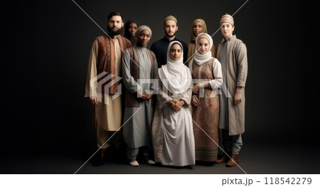 Capturing the richness of diversity, the photograph features individuals from ten different races and cultures adorned in Muslim attire, showcasing a harmonious blend of ethnicities within the Muslim