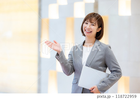 ポイントを説明するスーツの女性