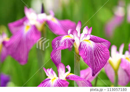 初夏の公園 綺麗に咲く花菖蒲の風景