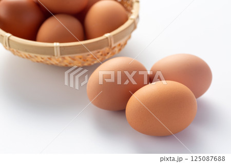 竹かごに入った鶏の卵(赤玉)のクローズアップ