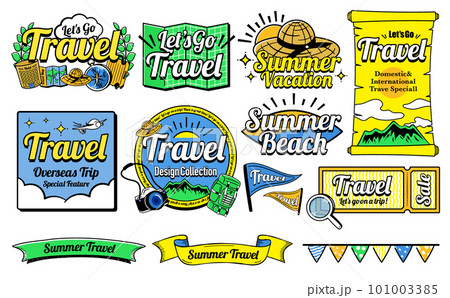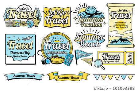 アメリカンビンテージ風クールでおしゃれな夏旅行・トラベルのデザインタイトルロゴセット_黄色水色