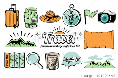 アメリカンビンテージ風クールでおしゃれな夏旅行・トラベルのデザインアイコンイラストセット_赤黄緑