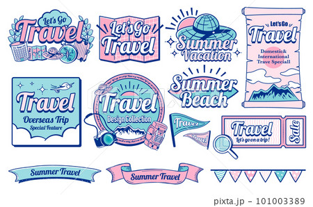 アメリカンビンテージ風クールでおしゃれな夏旅行・トラベルのデザインタイトルロゴセット_主線青ピンク