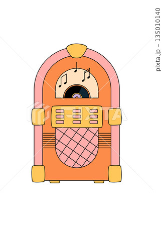 Retro groovy jukebox vinyl box in orange style, classic vintage music record audio player. Groovy element and y2k box bring nostalgic mood, colorful illustration for fun music themes.