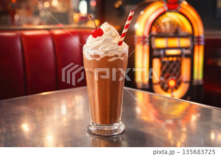 Tall Chocolate Milkshake on Table with Vintage Jukebox Background