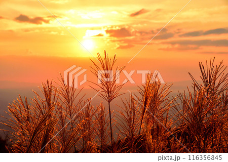 《奈良県》秋の葛城高原 夕日で赤く染まるススキの穂