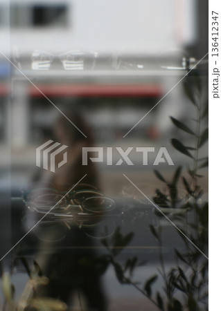 眼鏡店の窓と女性歩行者(ソフトフォーカス)