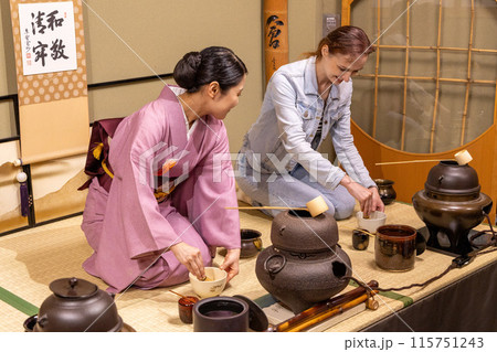 茶道体験を楽しむ着物姿の外国人女性観光客と日本人女性