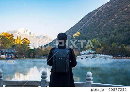 Young man traveler traveling at Black Dragon Pool