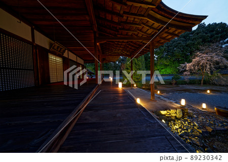 京都泉湧寺雲竜院の本堂と庭園のライトアップと桜