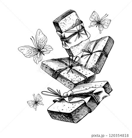 Handmade soap in craft paper, tied with a rope with butterflies . Graphic illustration line art hand drawn in black and white colors monochrome. Arrangement, composition, sublimation