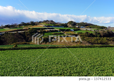 晴天の岩堂山を望む一面緑の畑(ワイド)