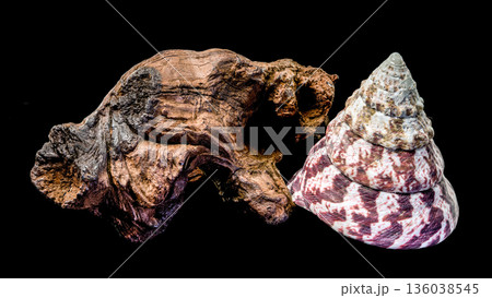 Maculated Top Shell Snail Next To Natural Driftwood Piece