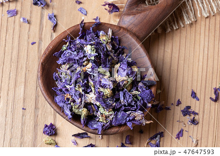 Dried purple mallow tea flowers, in a wooden bowl. Mauve-purple flower heads of Malva sylvestris, also known as common mallow, used for herbal tea and in traditional medicine. Close-up, from above.