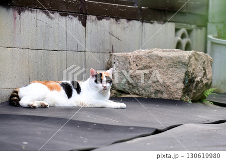 深い霧が晴れやっと日が差して冷えた身体を温める地域猫のオス