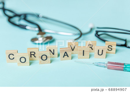 Pandemic and virus concept - Coronavirus text with syringe and phonendoscope on red background. Novel coronavirus Covid-19. Top view