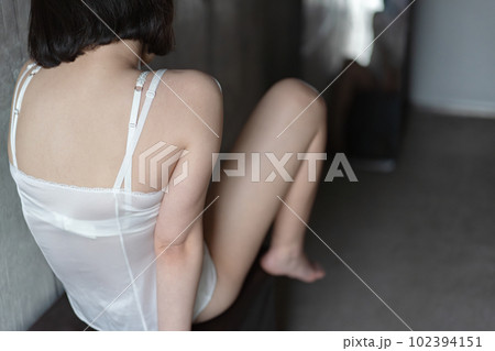 鏡の前に下着姿で座る女性