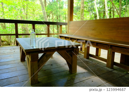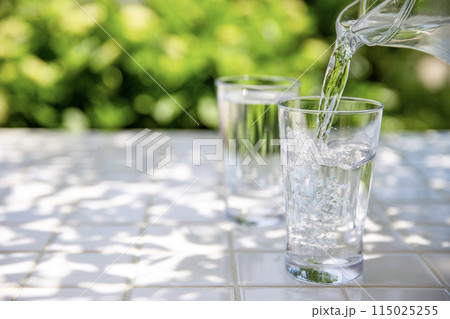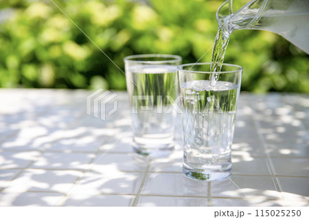 テラスに置いた冷えたグラスの水 / 熱中症対策のコンセプトイメージ