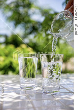 水を注ぐ 木陰のテーブルで冷たいミネラルウォーターを飲む