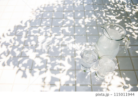 テラスで水分補給 木陰のテーブルのグラスとピッチャー