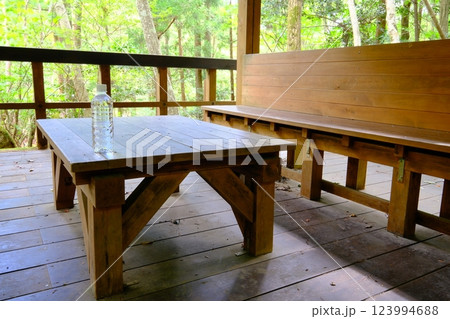 テラスで水分補給 木陰のテーブルで冷たいミネラルウォーターを飲む