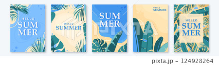 Summer tropical set vector background. Tropic posters with jungle palm leaves, monstera, banana in minimal simple flat modern style. Beach, sun and sea card, banner design. Travel paradise vacation